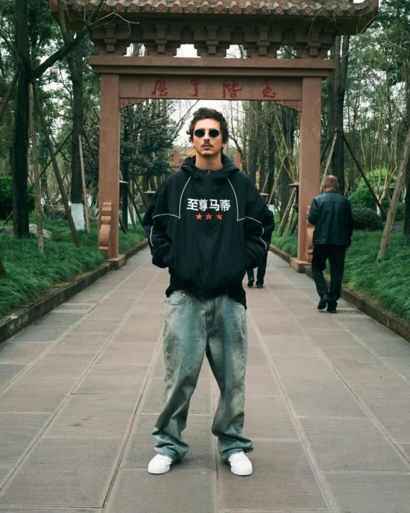 Actor Timothée Chalamet stepped out during a China press tour wearing a custom “Marty Supreme” jacket created