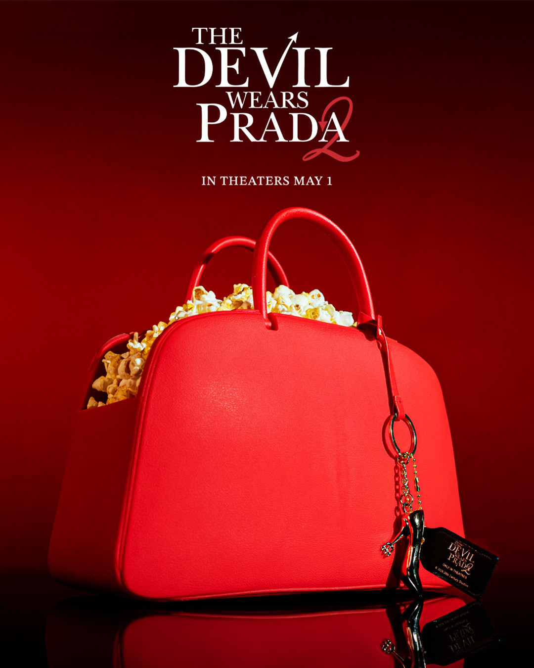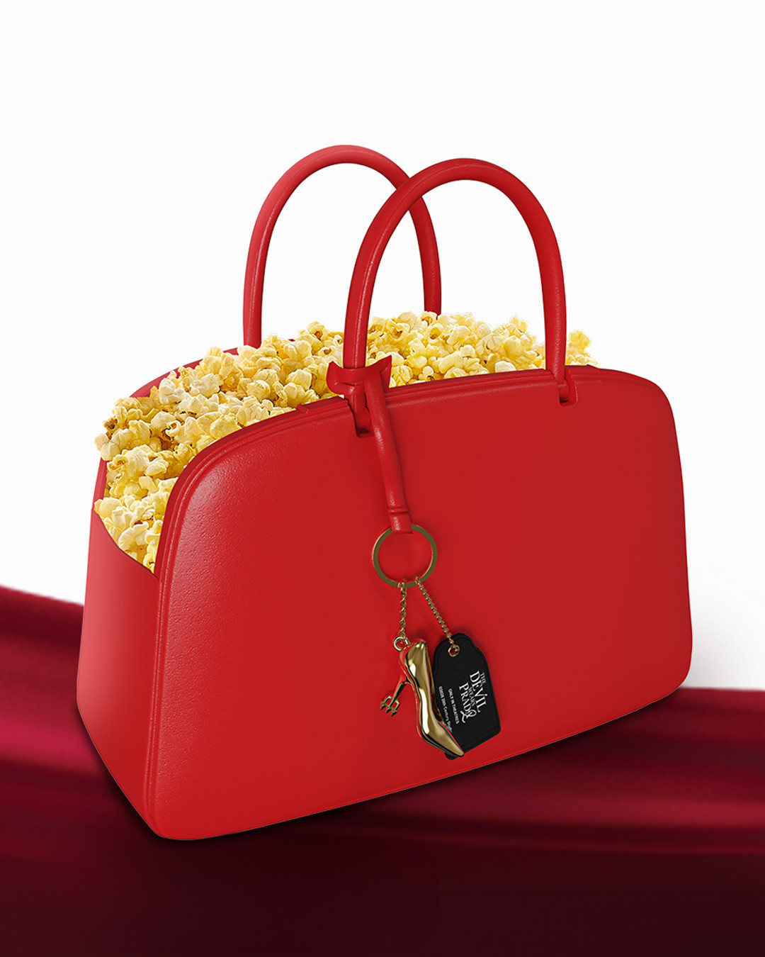 To celebrate the film’s release, theater chain Regal Cinemas is introducing a handbag-shaped popcorn bucket, transforming the classic movie snack container into a fashion accessory. The bright red collectible is designed like a small handbag, complete with a handle so viewers can quite literally carry their popcorn like a purse.