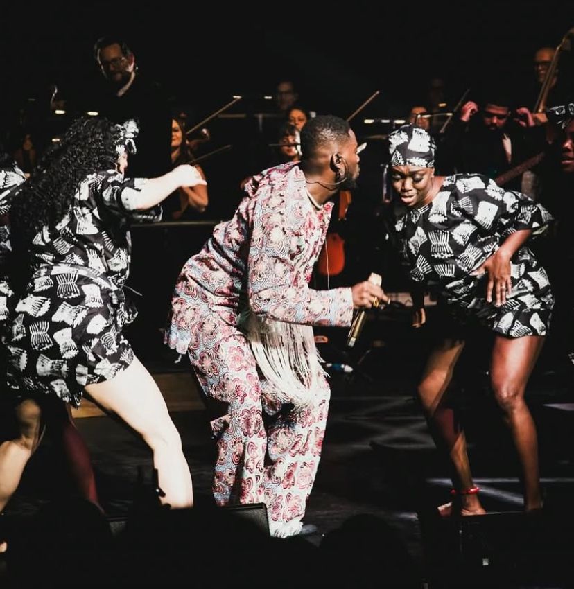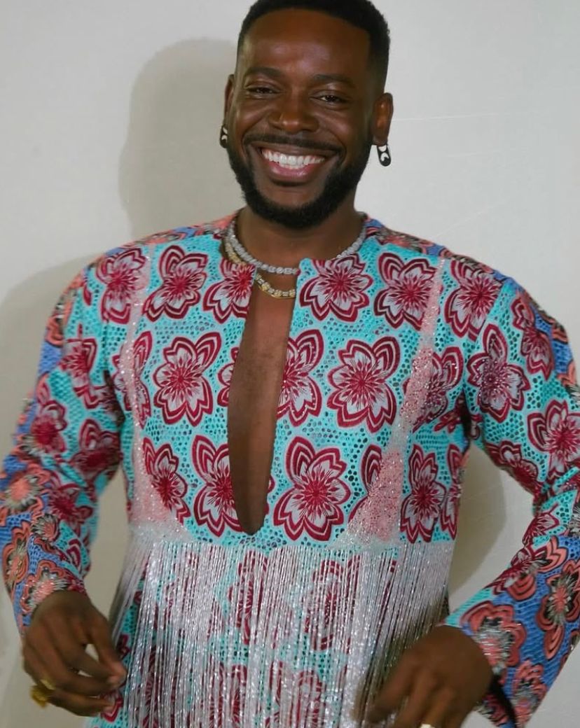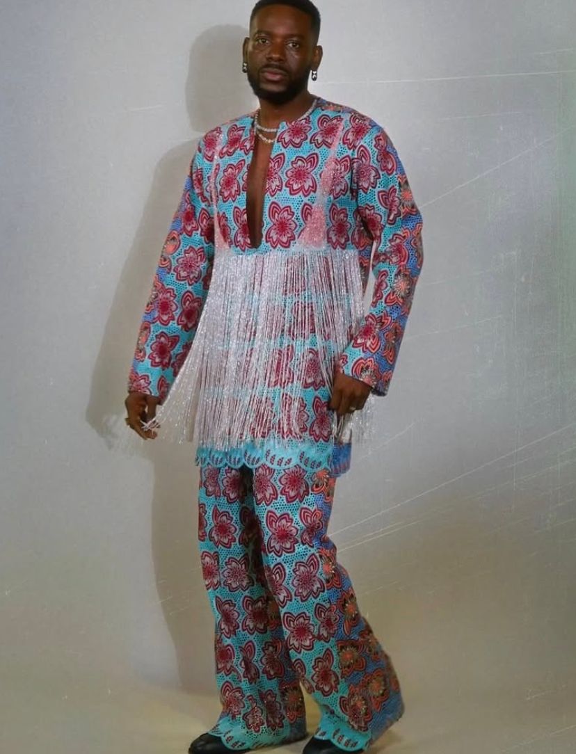 The real highlight is the fringe: long, delicate white strands that drape from the chest down the torso, moving with every shift of his body. It adds a sense of rhythm and fluidity, almost like the outfit is performing alongside him. Paired with his jewellery and a simple black shoe, the look balances softness and confidence in a way only Adekunle Gold seems able to pull off.