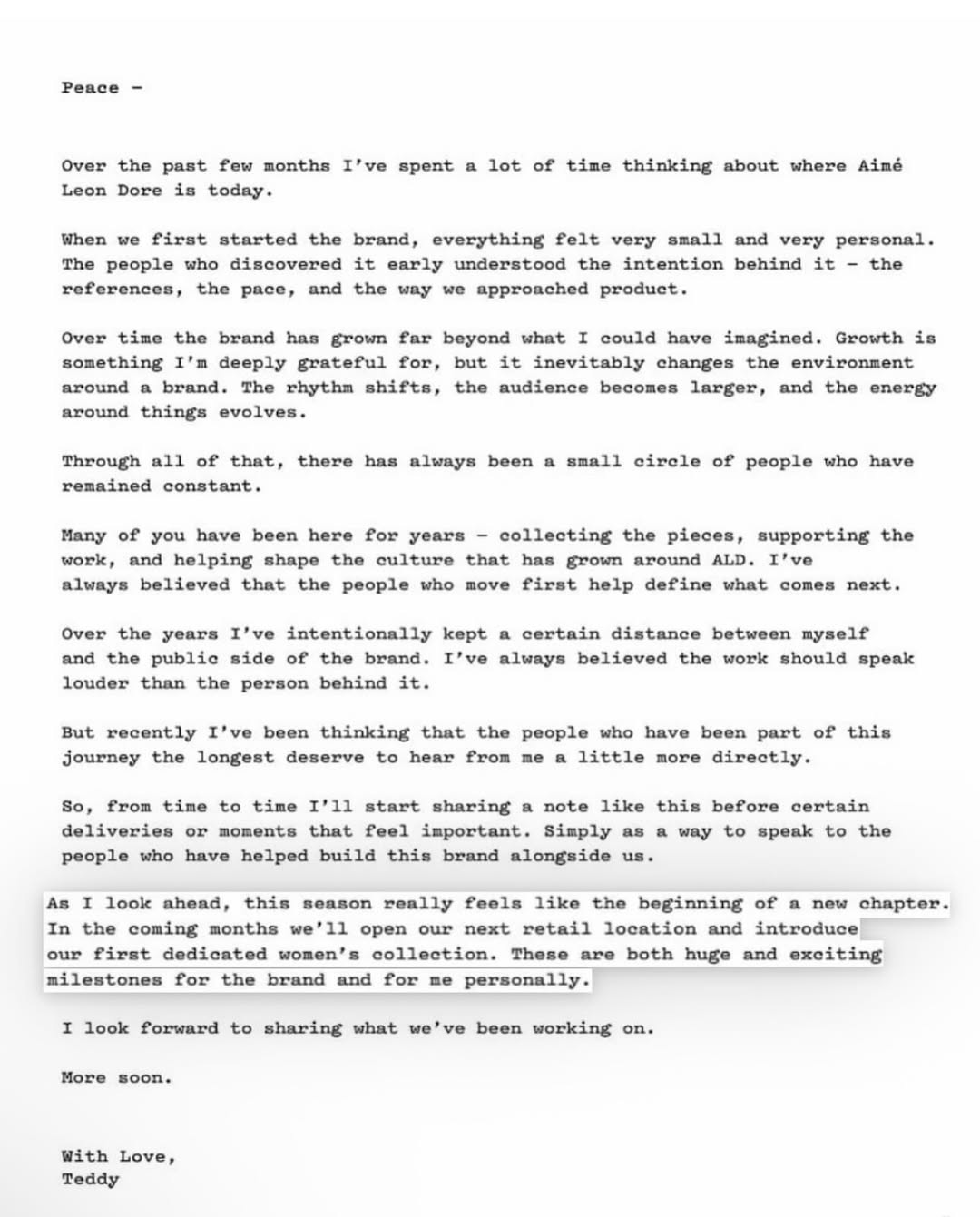 Santis used the note to acknowledge the early supporters who helped shape the brand’s culture, explaining that growth has pushed ALD far beyond its early days when operations were “small and personal.”
