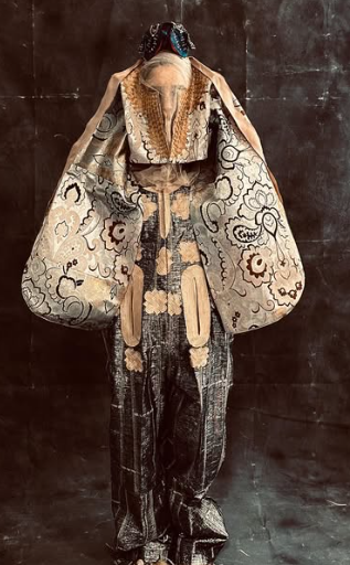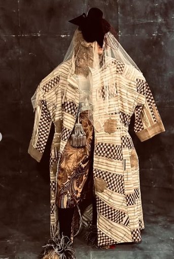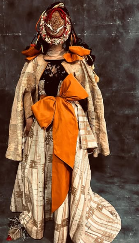 The archive isn’t simply displayed; it’s transformed. Every piece has been cut, layered, and reassembled into garments that function like living sculptures. Deep burgundy stripes meet earth-toned patchwork, while handwoven cloth drapes into long, architectural silhouettes. In one look, the figure is wrapped in rich, wine-colored Aso Oke with a burnt-orange headpiece blooming like a crown. Metallic ornaments rest over the face, turning the wearer into a walking relic, part spirit, part storyteller. Another ensemble pairs neutral-toned embroidered fabrics with a sweeping skirt and a dramatic orange bow tied at the waist. The effect is regal but expressive, as if history itself has been dressed for the future.