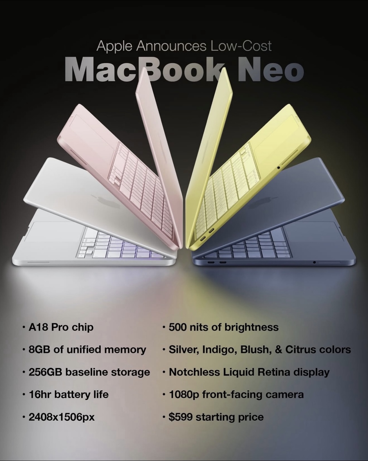 Visually, the MacBook Neo arrives in four finishes: silver, indigo, blush, and citrus, giving the entry-level machine a more playful color palette.