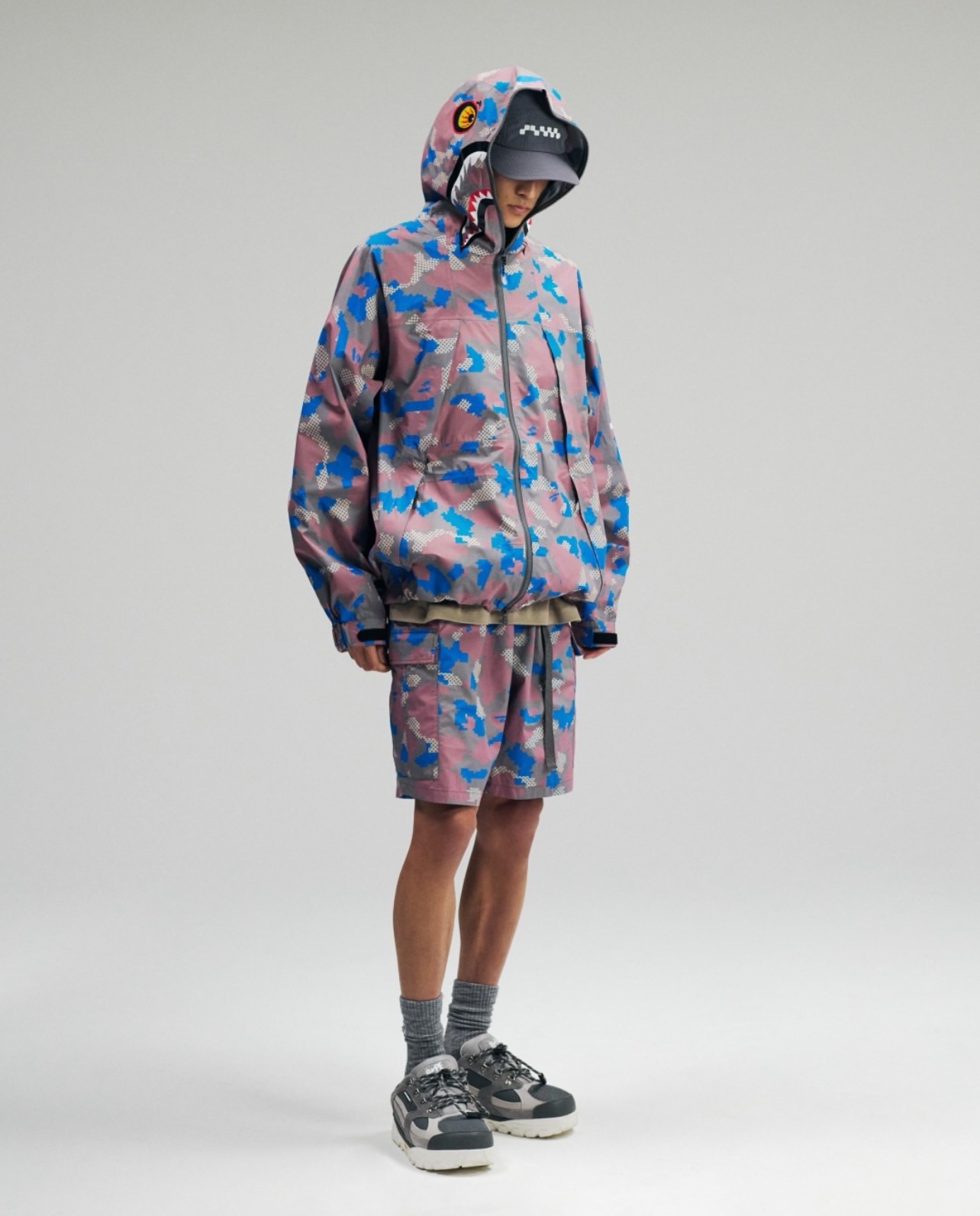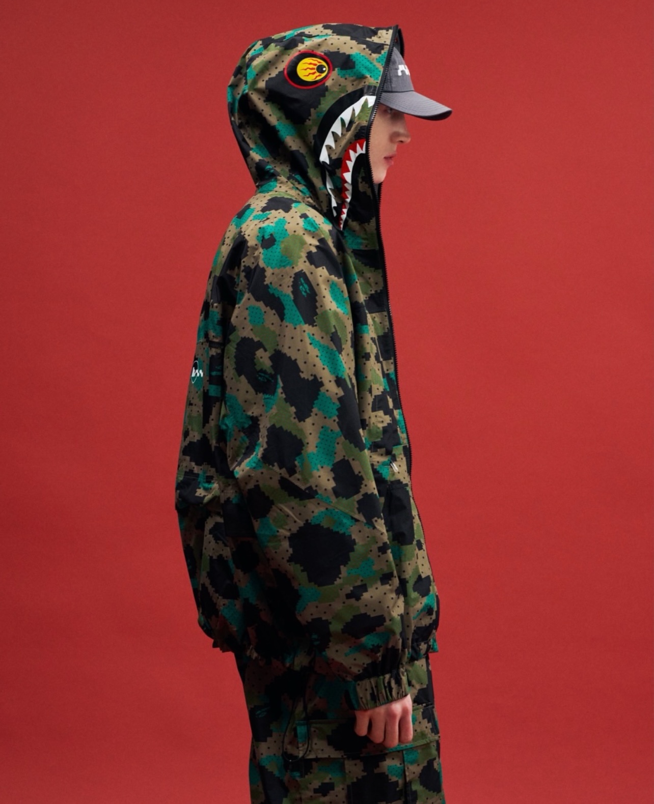 At the center of the collection is a redesigned take on BAPE’s signature Shark Hoodie. Dubbed the After-Hood Shark Hoodie, the piece introduces a more modular construction that leans into performance-driven design while keeping the bold identity the brand is known for.