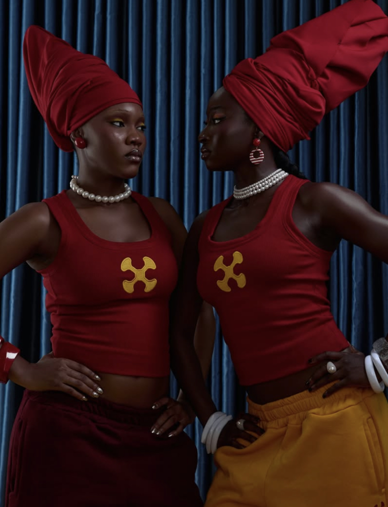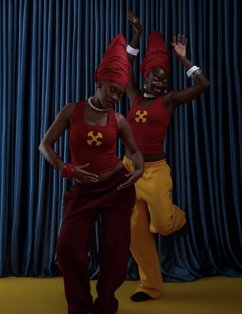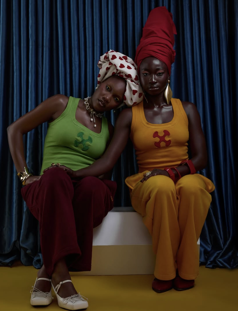 BL Brand’s new “Essential Drop” leans into warmth, softness, and the quiet power of intentional craftsmanship. The pieces, hand-dyed, cotton-rib tanks paired with relaxed trousers, are styled in a way that feels intimate and distinctly Nigerian, almost like a portrait of sisterhood. In the image you shared, the palette does the heavy lifting: deep burgundy, fresh green, and a sun-bright yellow come together against a moody blue backdrop, giving the clothes a richness that goes beyond basics.