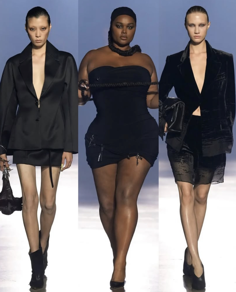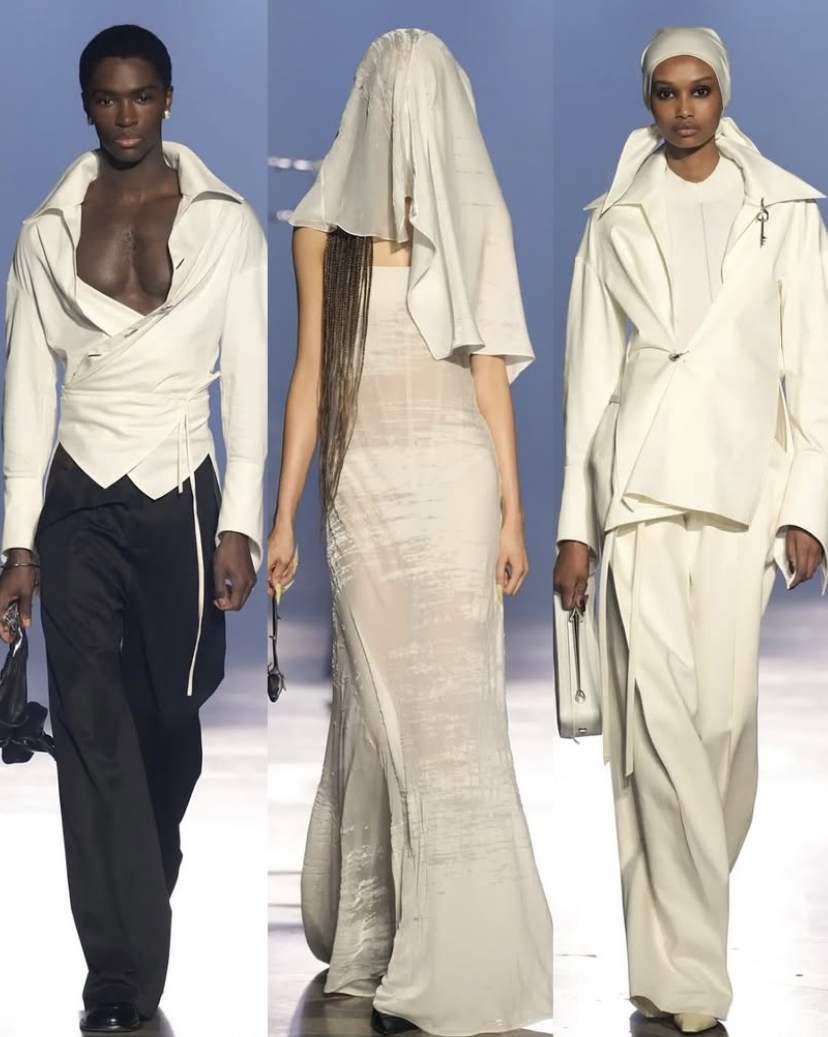 Grace Ling’s Spring/Summer 2026, titled “Future Relics,” leans into an aesthetic of tension, between antiquity and futurism, strength and decay. Lace-like distressing, scorched textures, glitch effects, and burn-marks unravel on fabrics that shift from opaque to sheer, exposing glimpses of form beneath. These raw treatments contrast sharply with razor-sharp tailoring: sculpted blazers, pillar skirts, structured trousers, and belted coats that hold the chaos in check.