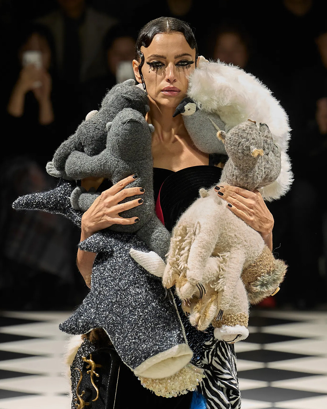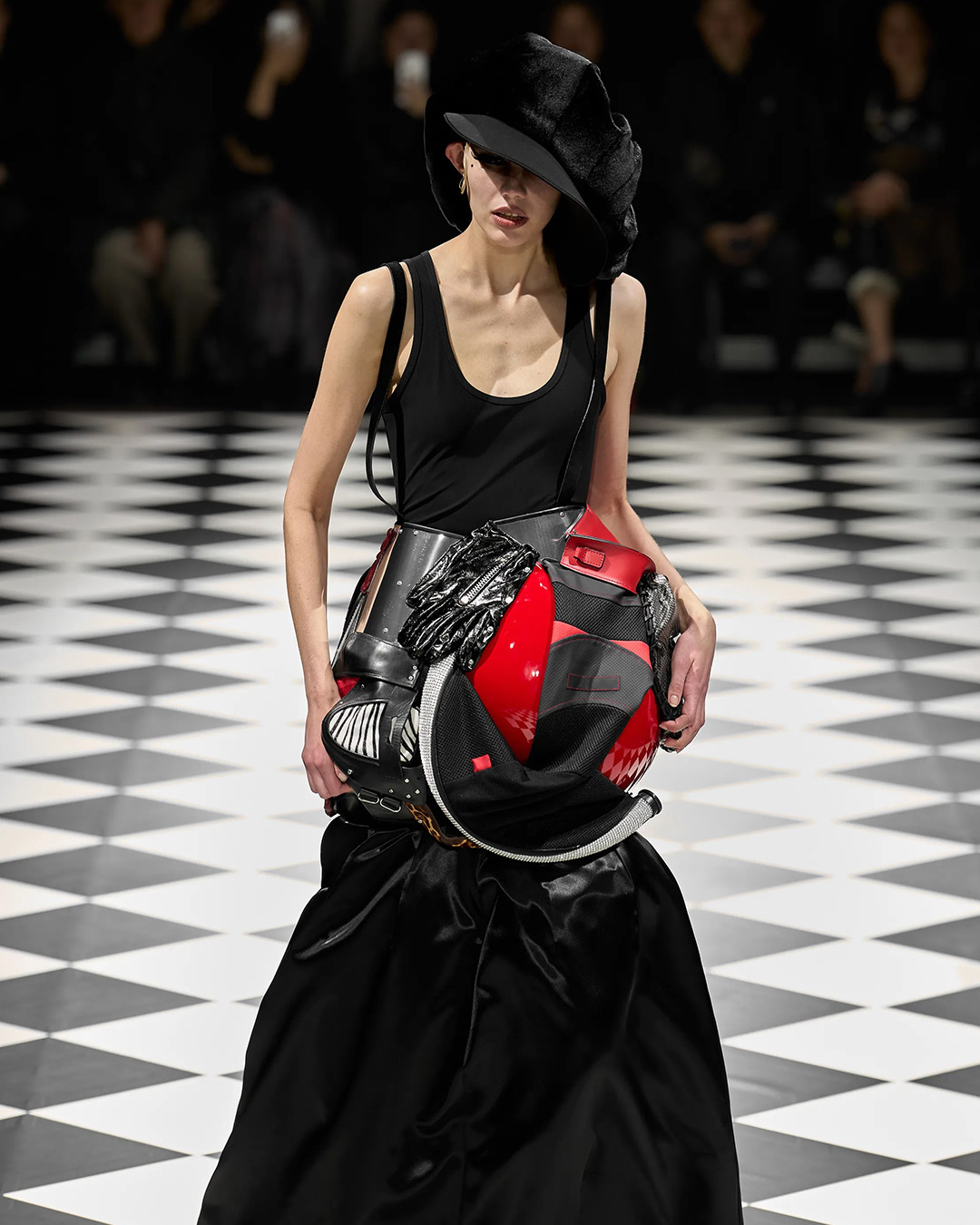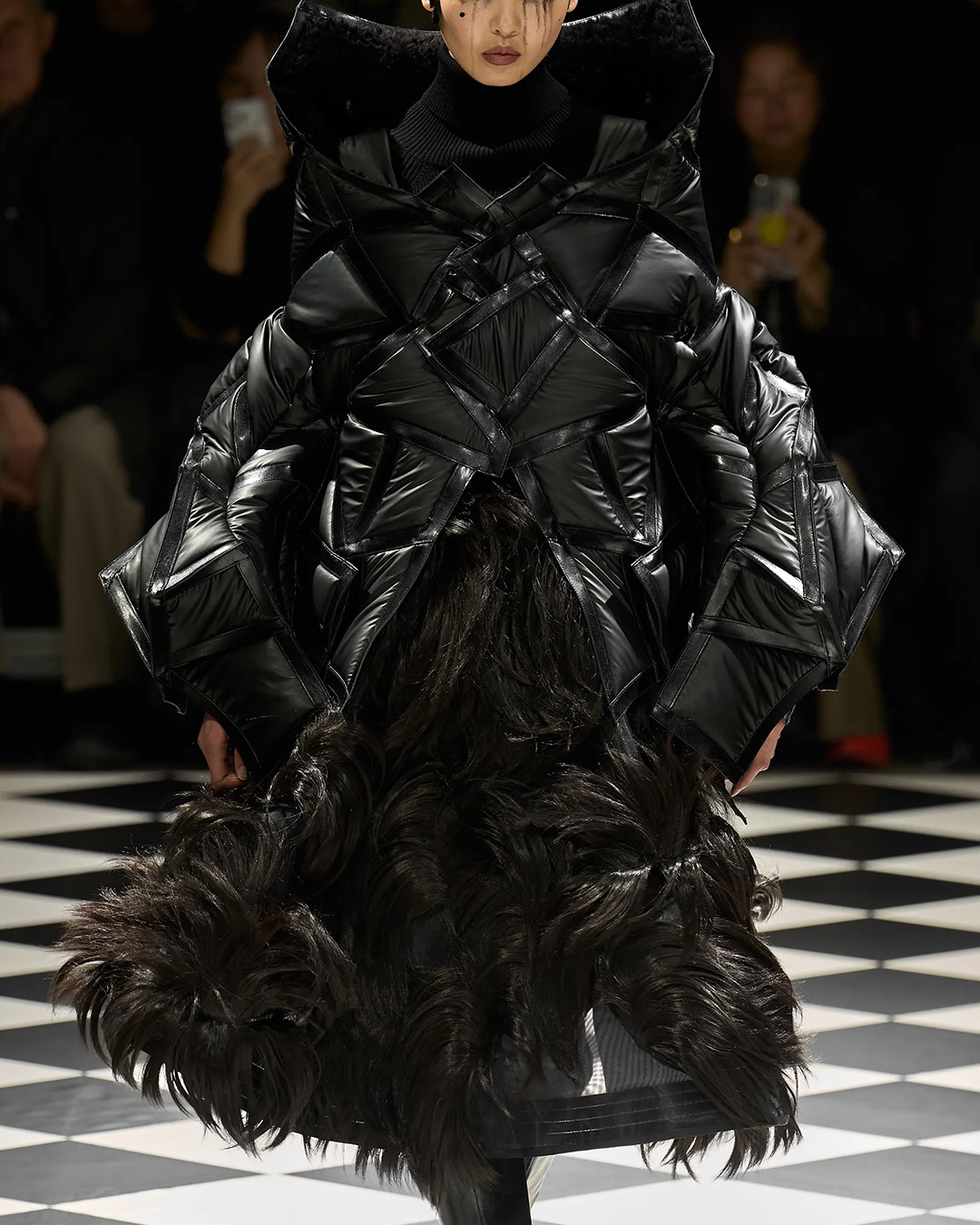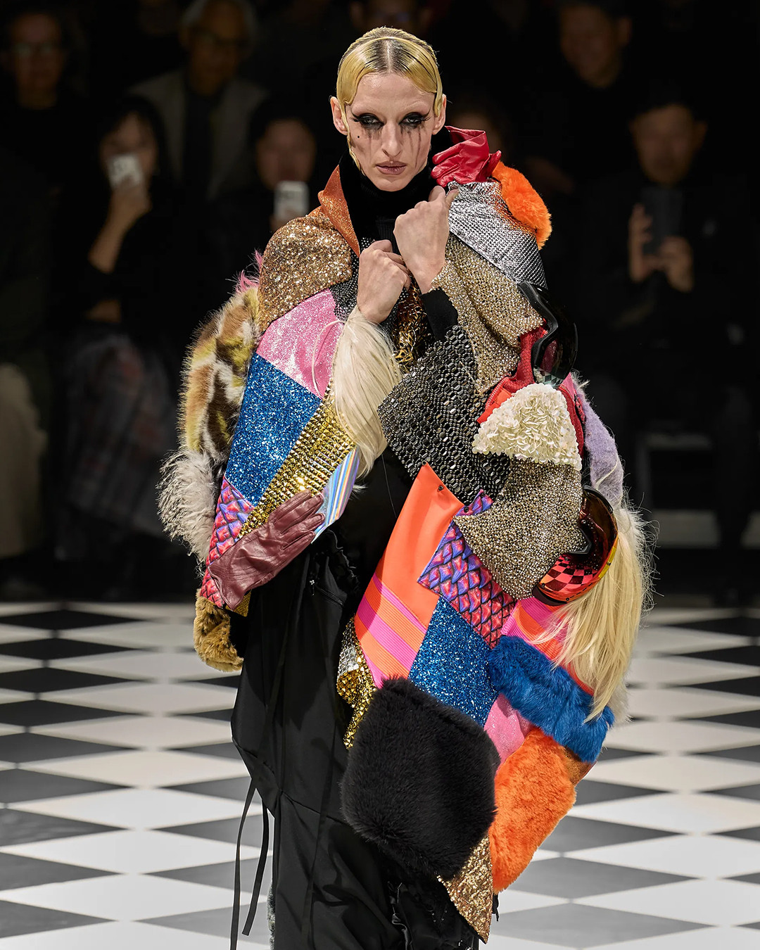 The collection explored Watanabe’s love of moto culture, reimagining helmets, gloves, and protective gear into oversized, sculptural silhouettes. Playful contrasts came from pieces adorned with faux fur, Lurex knits, and stitched-in stuffed toys, creating a fusion of toughness and whimsy.