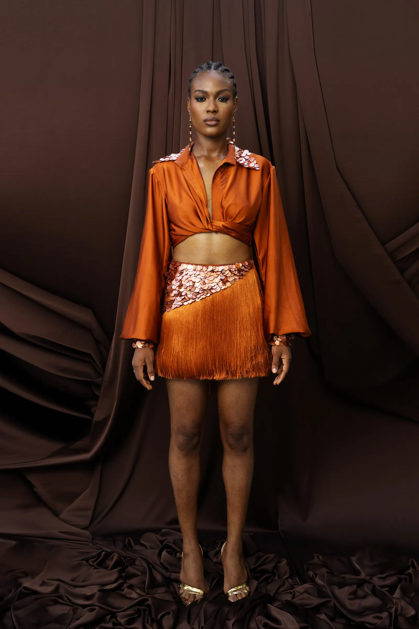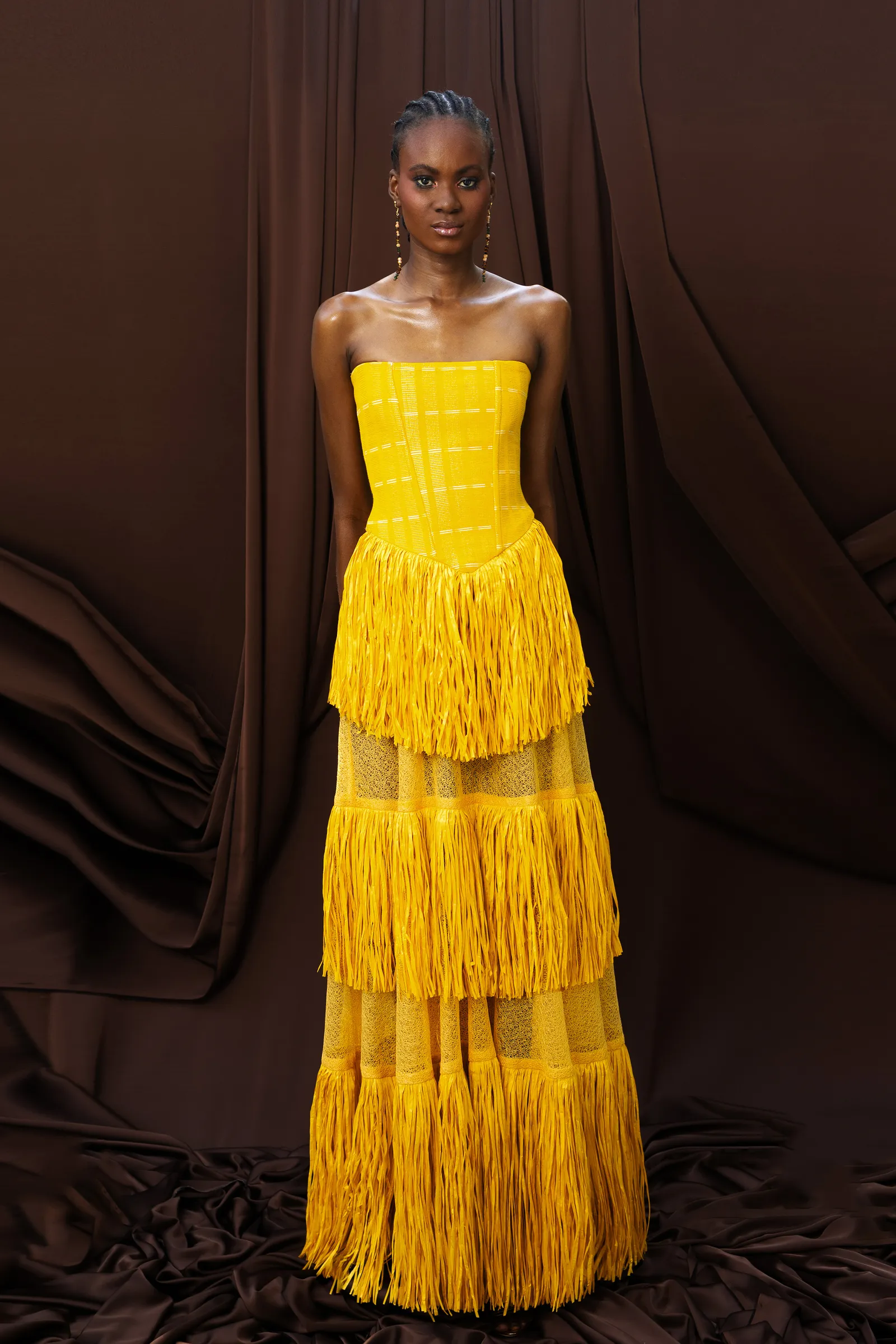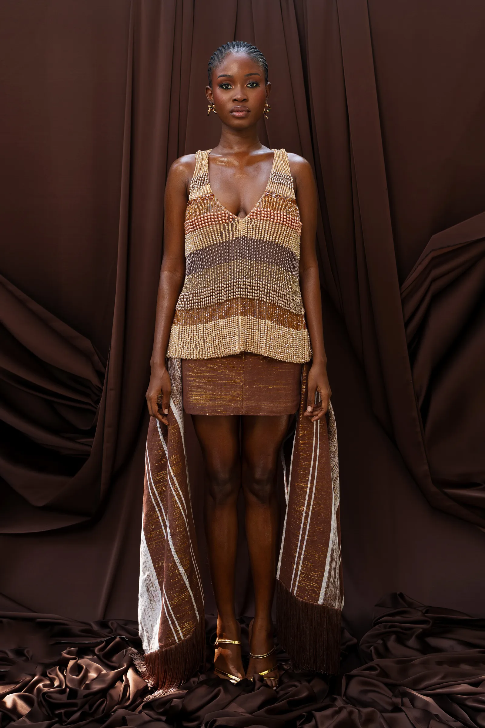 Stand-out pieces included a yellow Akwete corset dress accentuated with lace and raffia detailing, and a multi-toned beaded V-neck top paired with a brown mini-skirt. Each piece felt like a chapter in a story of slow design and deliberate materiality. It’s a quiet but potent message: in an industry often defined by excess, KILENTAR argues for intention.