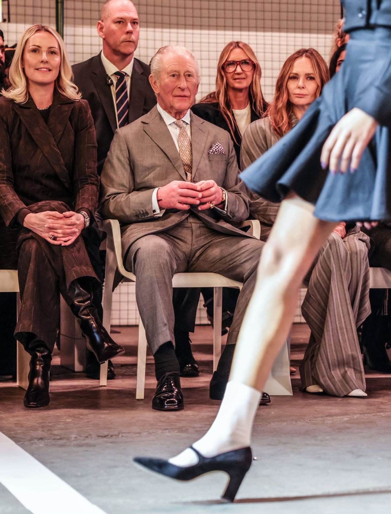 The King watched the show alongside design figures including Stella McCartney and British Fashion Council CEO Laura Weir, underscoring the broader industry support behind emerging talent.