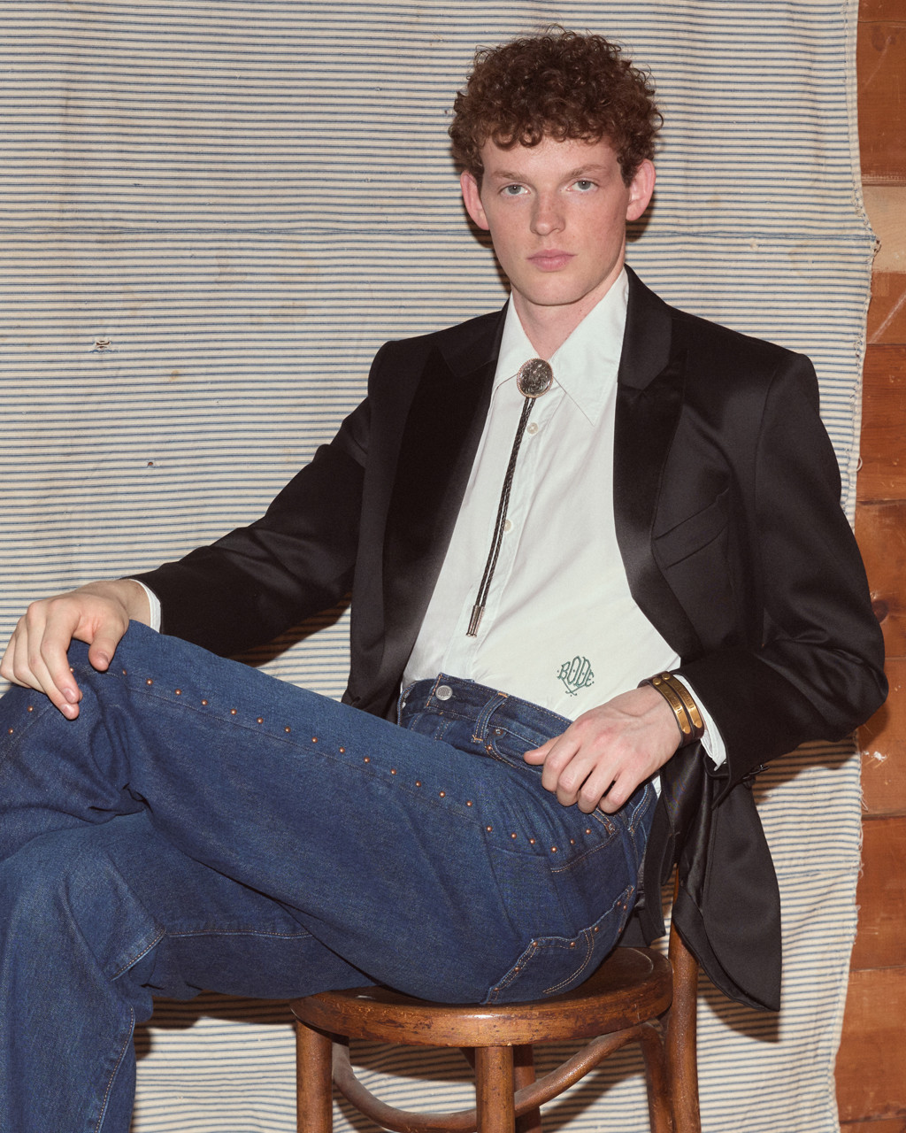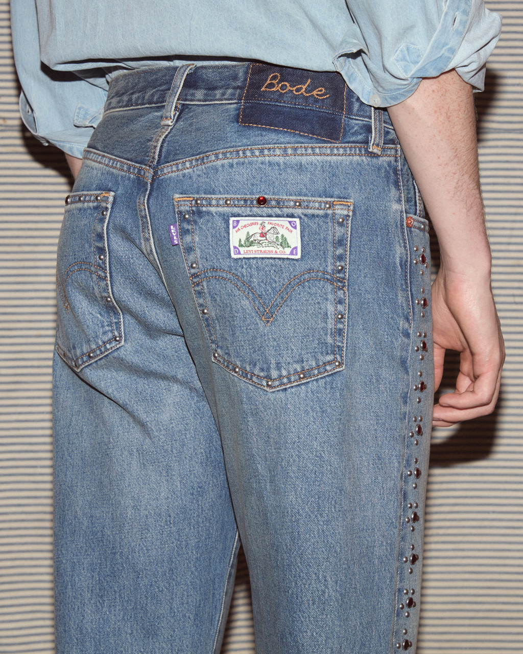 The Levi’s × Bode Barrel Racer Jean will first release exclusively at Bode Tokyo on April 3, followed by a wider launch on April 10 at Bode stores in New York, Paris, and Los Angeles, as well as online.