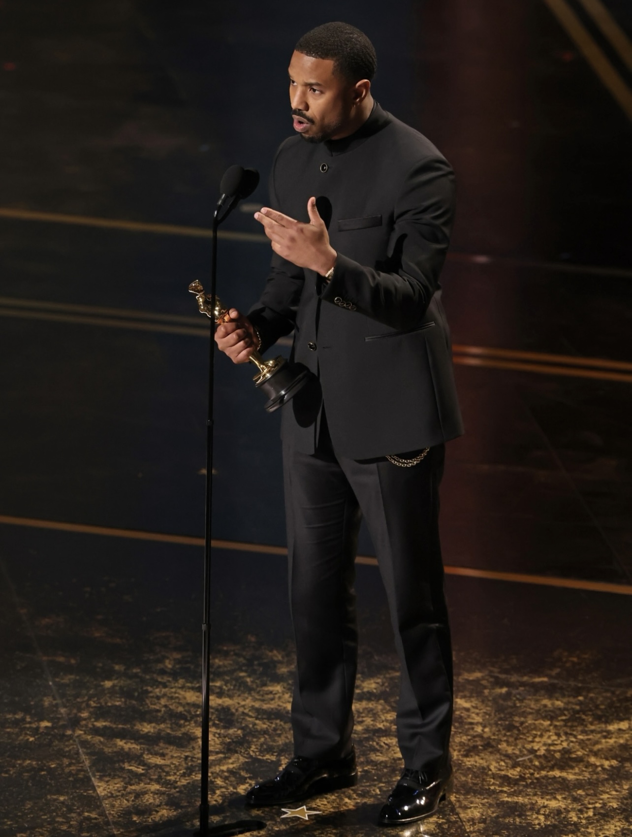 The actor secured his first Oscar, wearing Louis Vuitton and taking home Best Actor at the 98th Academy Awards for his performance in the film Sinners, a role that saw him portray twin brothers in the Ryan Coogler-directed project.