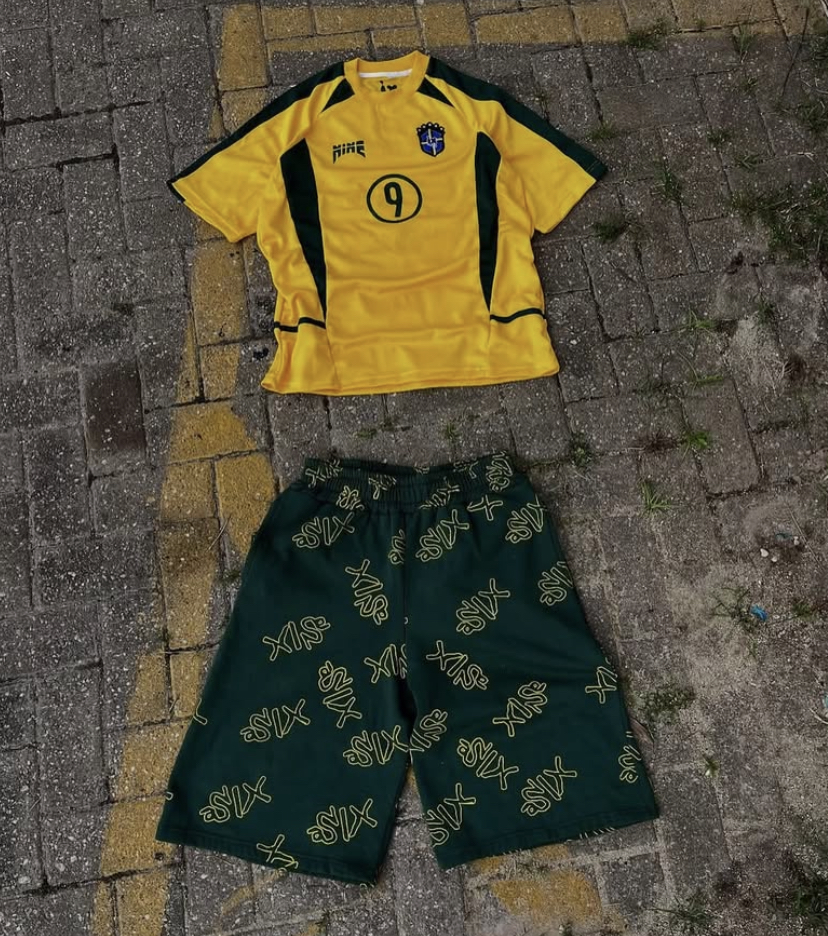 The set you shared pairs a reimagined Brazil-inspired yellow jersey with deep-green shorts covered in an all-over “SIX” monogram, a graphic treatment that feels both sporty and mischievous. The jersey leans into classic football aesthetics but with Nine’s understated tweaks, while the shorts introduce a bolder, more expressive energy.