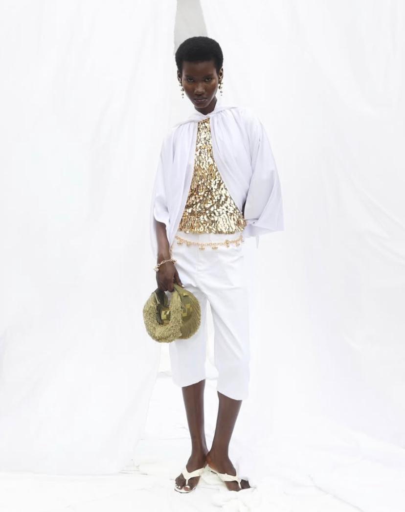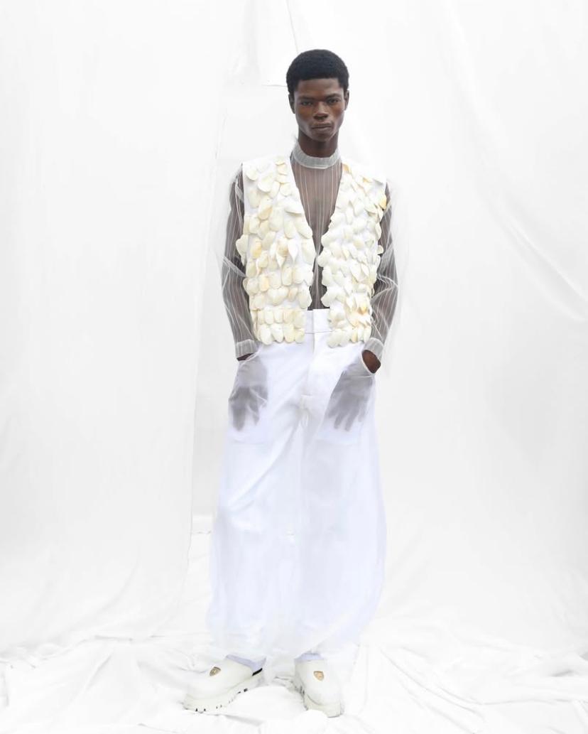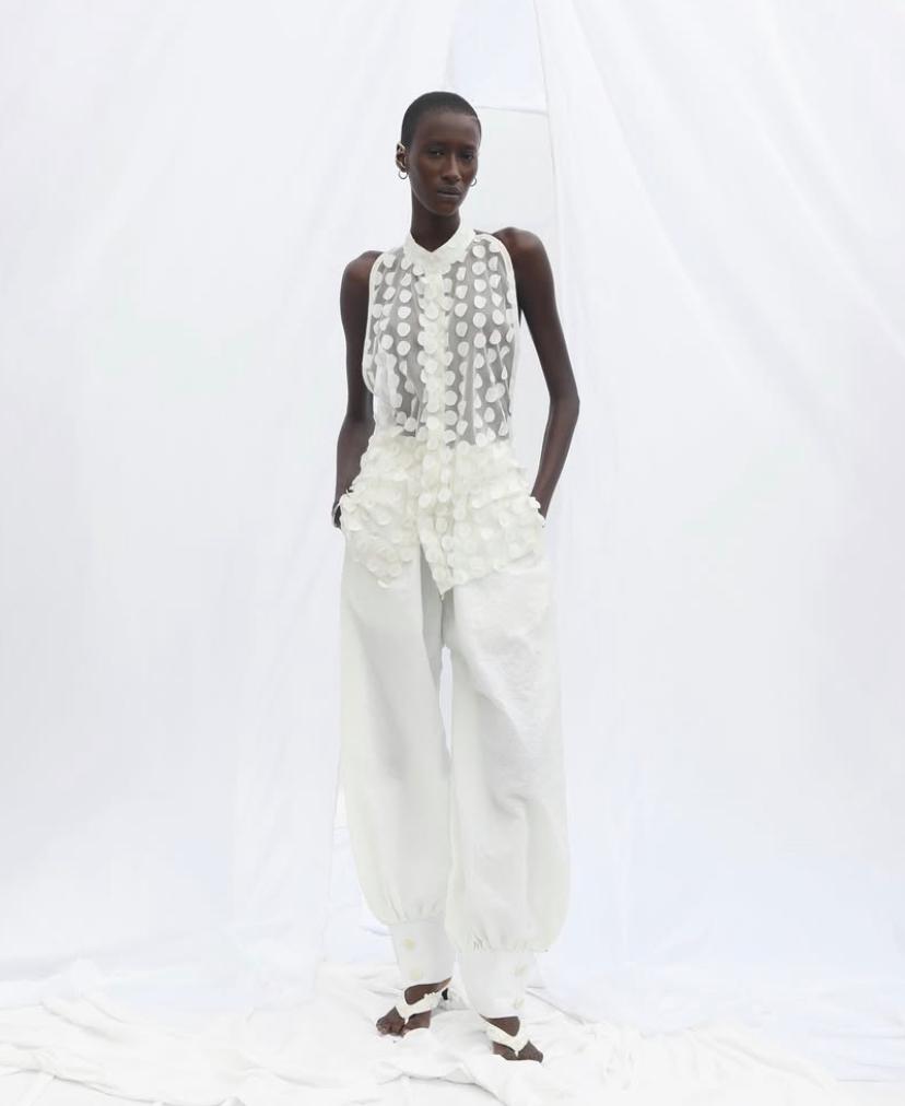 In a departure from the bright hues the brand is known for, the entire collection was rendered in all-white, evoking purity, healing, and a sense of quiet reflection. Through sculptural shapes, delicate fabrics, and a careful mix of textures, Oke-Lawal explored new forms of vulnerability. Key pieces included a crisp white shirt layered under a pleated cream vest, paired with inflated balloon trousers, and a sheer one-shoulder top trimmed with feathers and finished with an exaggerated rope hem.