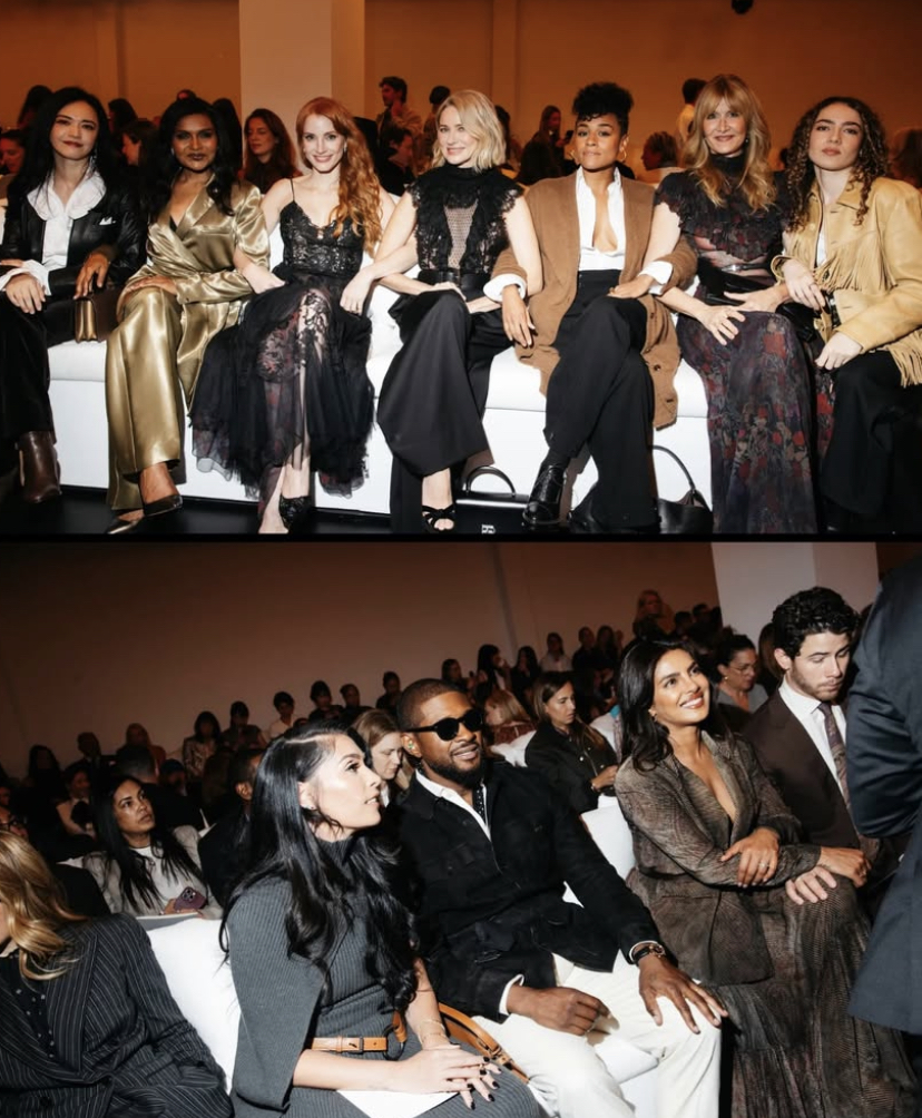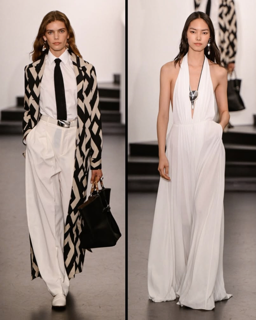 Lauren also tested texture and form in motion. Models walked down a dramatic black-and-white staircase in combinations like black bras paired with flowing white coats and tailored pants. Later, the line shifted through floral patterns, stripes, and shimmering evening wear, ending with slinky gowns and glinting sequins that balanced glamour with wearability.