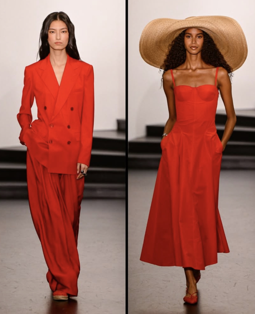 Visually, the collection leaned heavily into bold contrasts: rich reds, stark blacks, and crisp whites dominate the palette. Key looks included monochrome two-piece sets, floor-length dresses, sundresses, and sleek accessories that emphasized femininity with a touch of strength and elegance. Even the set decor, a black-wicker chandelier, white walls, sprawling white couches, played into that theme, creating an atmosphere that felt both intimate and powerful.