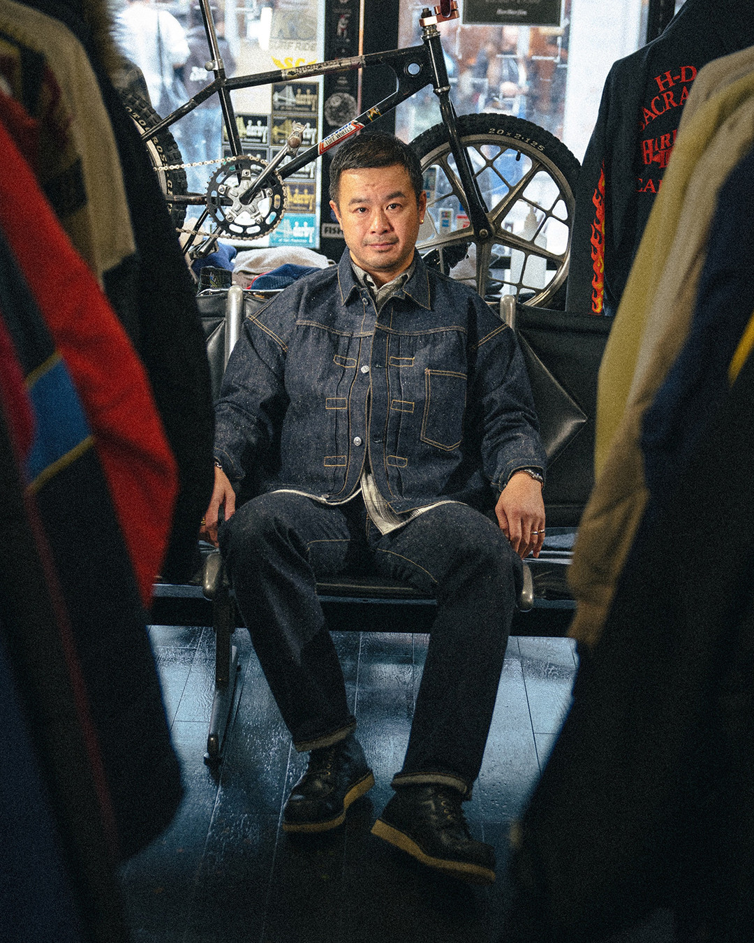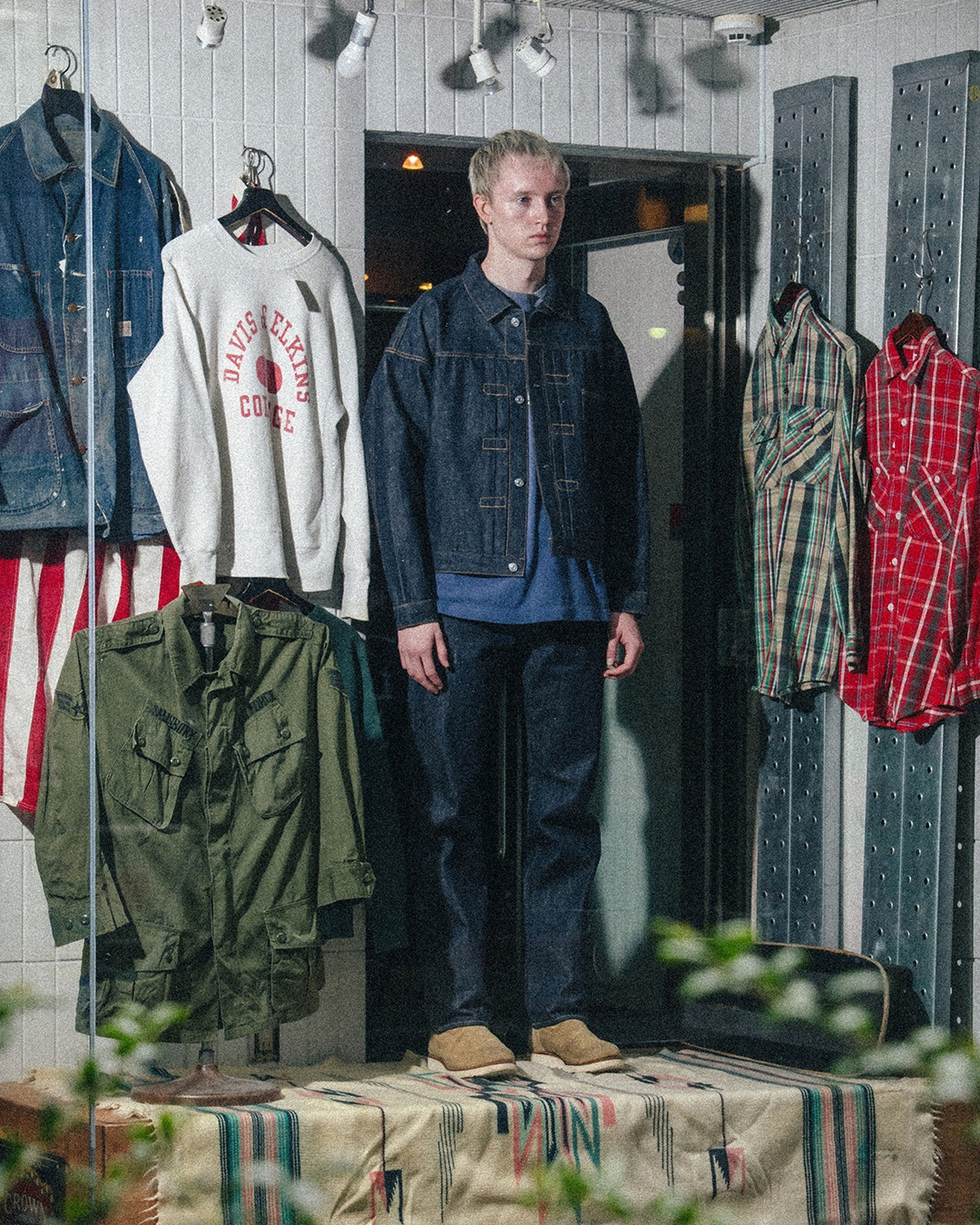 The release also includes a collaboration with BerBerJin, one of Harajuku’s most respected vintage institutions. The partnership focuses on heritage denim, recreating a World War II–inspired denim jacket and matching pants produced using custom-developed fabric designed to capture the texture and aging of vintage military-era garments.