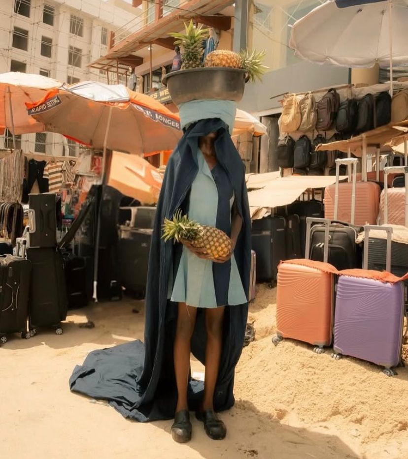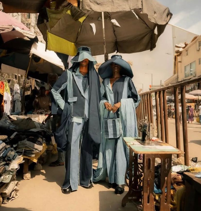 In the campaign imagery, models stand within what looks like a real marketplace: sewing machines pushed to the edge of dusty walkways, vendors selling denim scraps, and the architecture of Lagos buzzing in the background. The garments feel alive among the environment they reference, blurring the line between performance and daily ritual. One look features a pair draped in expansive denim sets, loose, long-paneled coats and wide-brim hats that shade the face, almost like modern masquerade masks. Another set presents a vibrant pairing in bright blocks of yellow and burnt orange. Oversized hats droop with exaggerated, sculptural drama; skirts, jackets, and totes echo the same square-cut patchwork, making the body itself a walking grid of labour and colour.