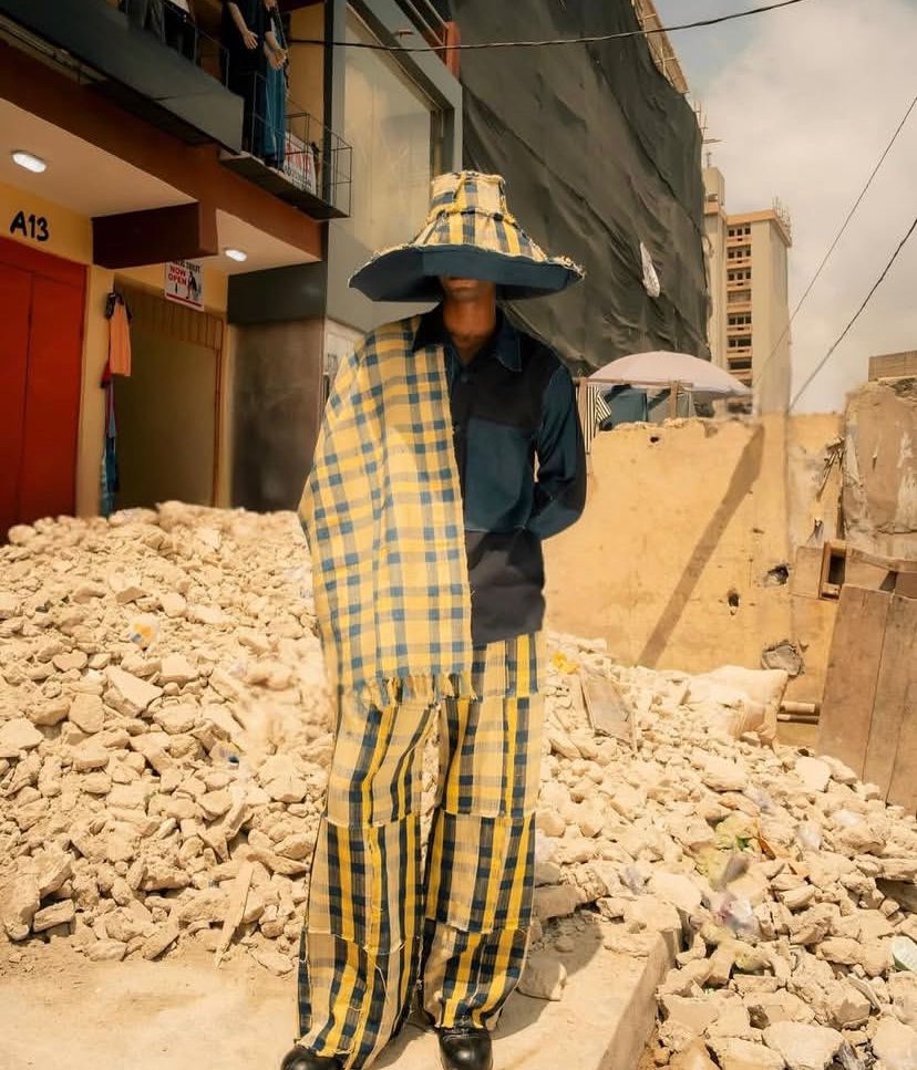 The collection draws from the pulse of bustling West African markets and the spiritual theatricality of masquerade, treating labour as something communal rather than mechanical. Instead of hiding the process, the garments emphasize it. Patchworked textiles appear like moving mosaics, indigo panels stacked in geometric shapes, turmeric and rust blocks stitched into crisp silhouettes, and plaid pieced alongside hand-dyed cottons. In this universe, seams aren’t merely functional; they are visible evidence of the many hands that worked to transform fabric into form.
