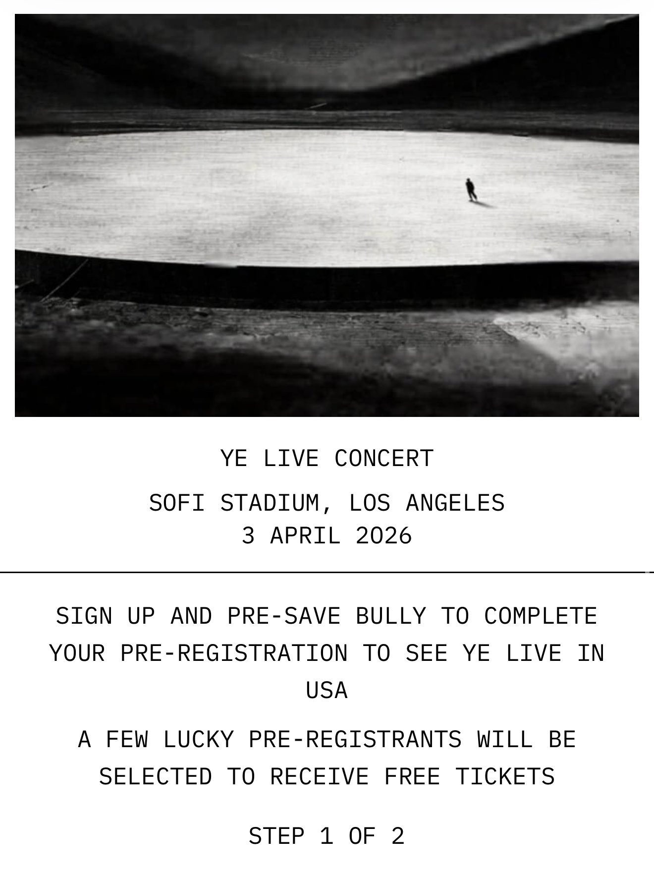 Fans interested in attending are encouraged to pre-register and pre-save Ye’s upcoming album Bully as part of the registration process. According to the announcement, a limited number of fans who complete the pre-registration will be randomly selected to receive free tickets to the show.